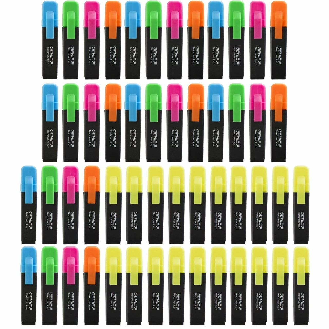 GENIE Textmarker in hochwertig, zeitlosem Design in einem Set: 40 Leuchtstifte in 20 x Neongelb, 5 x Neonorange, 5 x Neonpink, 5 x Neonblau und 5 x Neongrün, zur Aufbewahrung in PVC Tasche / Etui. Die Textmarker liefern dank der Qualitäts-Farben – Tinte (auf Wasserbasis) ein Schriftbild, welches extrem hell, farbintensiv und leuchtend ist. Die Stifte sind zum viel Markieren optimal. Genie Leuchtstifte sind bunt und perfekt zum Markieren von Textstellen, sind geeignet für alle gängigen Papiersorten und somit sind die Marker ideal für Schule, Uni, Büro und viele weitere Gelegenheiten.