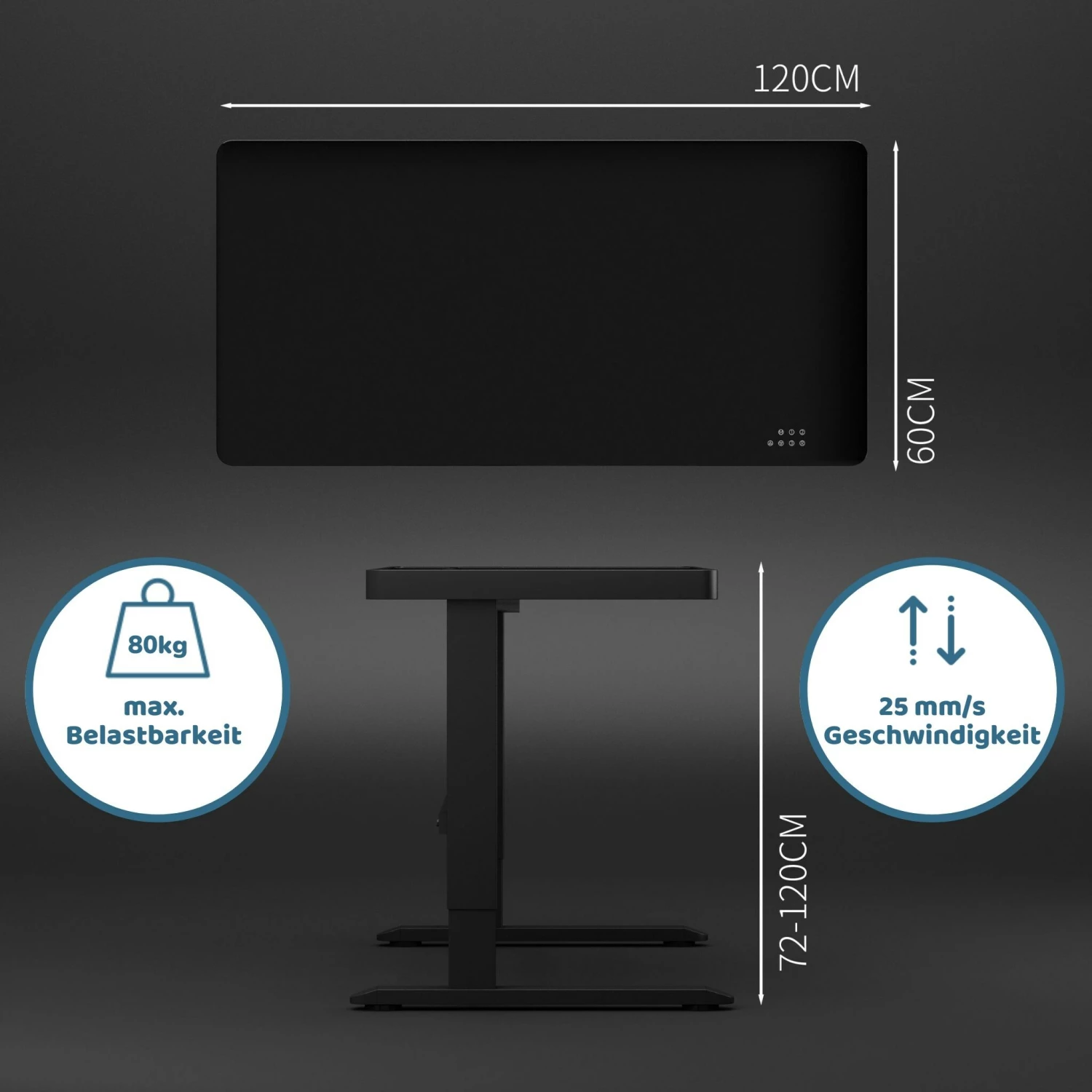 GROSSER VERSTELLBEREICH: Stufenlos elektrisch höhenverstellbar von 72cm bis 120cm. Perfekt geeignet zum Arbeiten im Stehen oder Sitzen auch für große und kleine Menschen oder Kinder. Die Größe der Tischplatte beträgt 120 x 60cm.