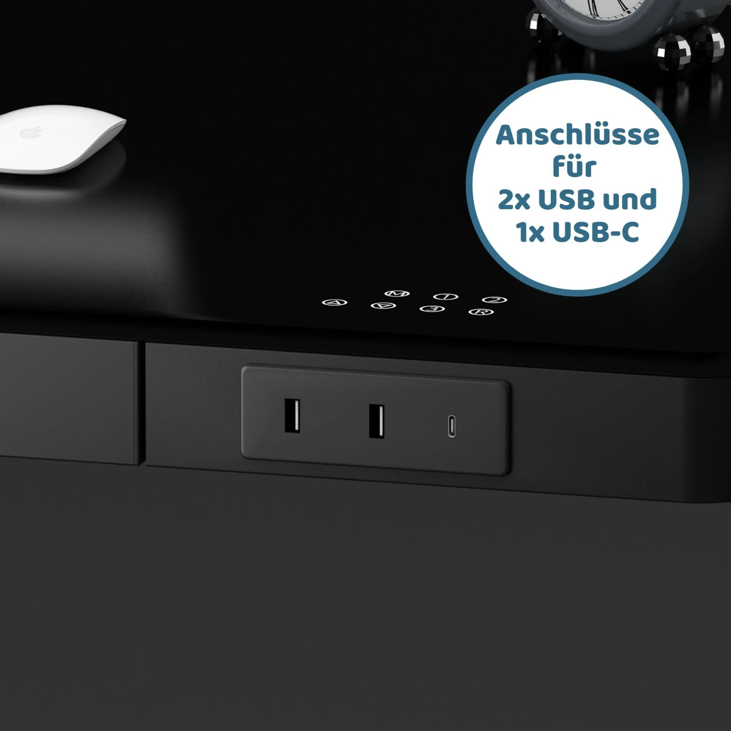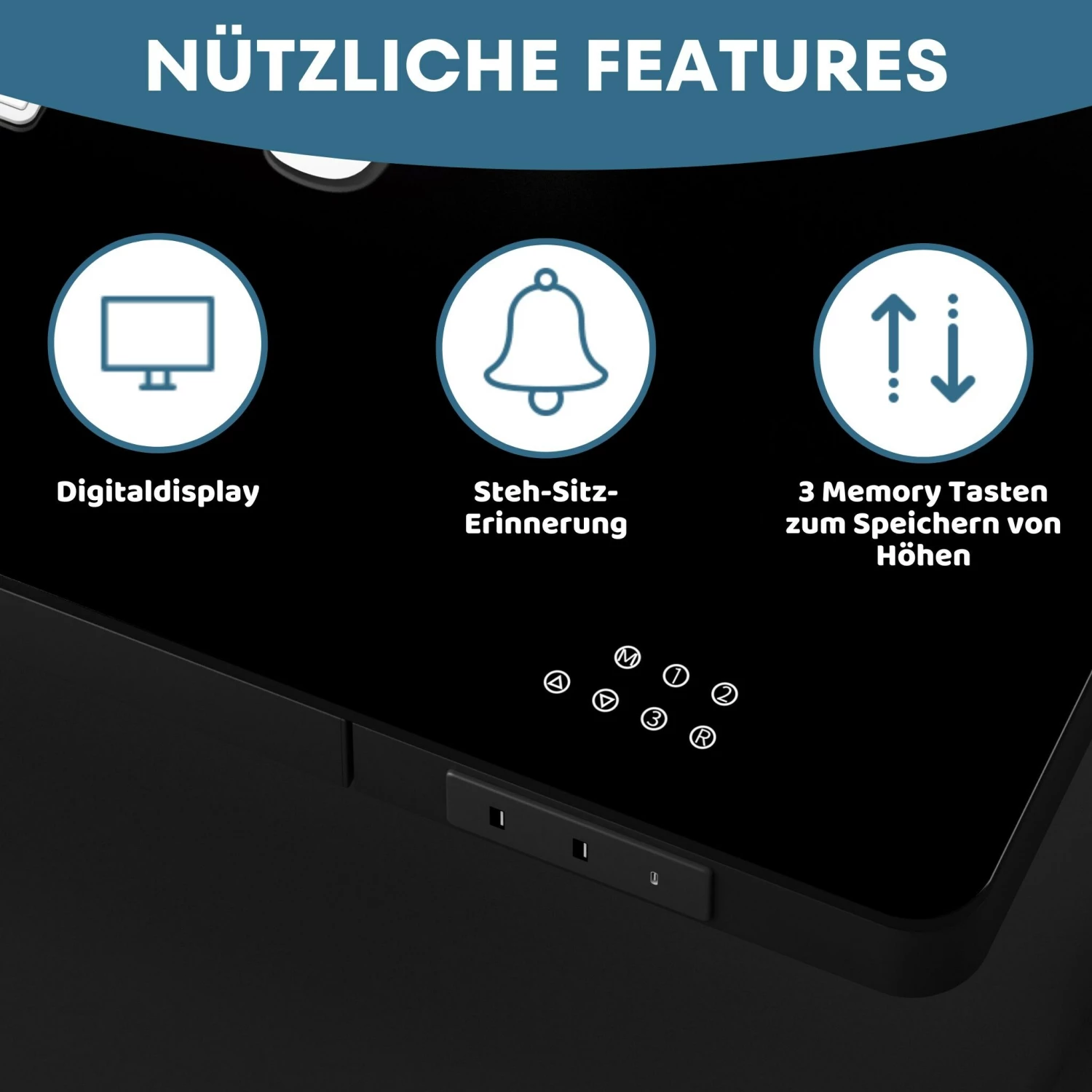 STEH-SITZ-ERINNERUNG, USB- & USB-C ANSCHLÜSSE UND WEITERE FEATURES: Der Schreibtisch besitzt zwei USB- und einen USBC-Anschluss, einen Timer zur Steh-Sitz-Erinnerung, ein Digitaldisplay und eine Speicherfunktion von bis zu 3 individuellen Höhen. Maximaler Komfort bei der Arbeit.