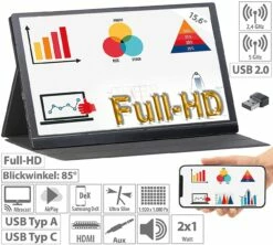 Auvisio EZM-210 (ZX-5067-675) : Ultradünner, Mobiler Full-HD-IPS-Monitor, (15.6″), 39,6 cm mit USB-C- und HDMI-Anschluss