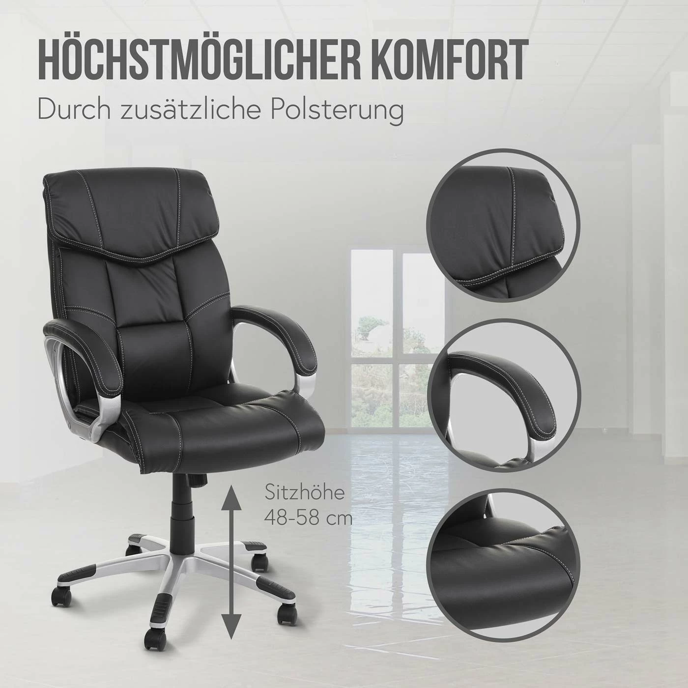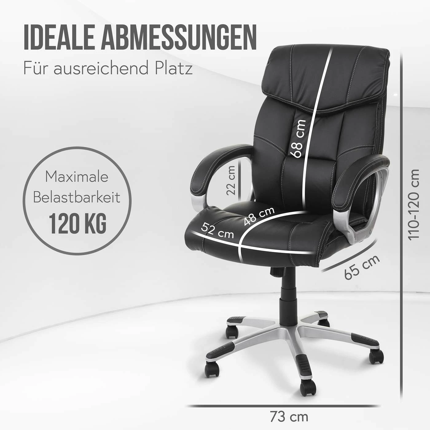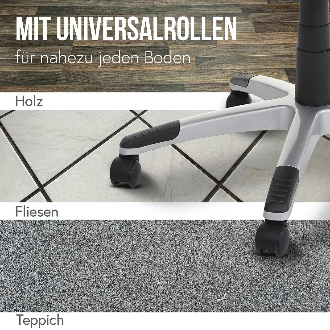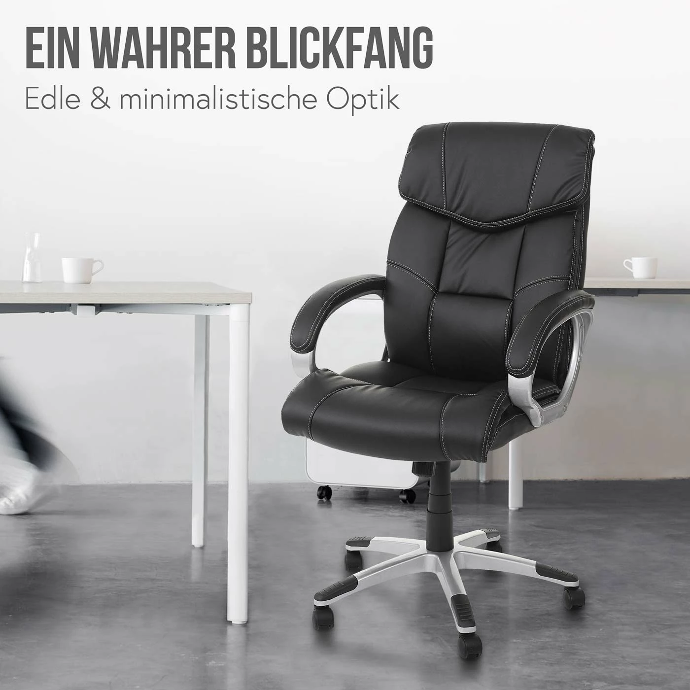 Dieser Bürostuhl in modernem und elegantem Design ist nicht nur etwas fürs Auge, sondern erfüllt hohe Ansprüche in Sachen Komfort und Stabilität. Die dicke Polsterung an Rücken- und Sitzfläche sorgt immer für eine bequeme Sitzhaltung, sodass Sie entspannt auch über längeren Zeitraum in dem Arbeitsstuhl sitzen können. Die nicht abnehmbare, gepolsterte Armlehne trägt ebenfalls zum Sitzkomfort bei. Dank der Universalrollen eignet sich dieser Computerstuhl, sowohl für harte Böden wie Parkett, aber auch für einen weichen Untergrund wie Teppich. Über einen praktischen Hebel kann die Wippmechanik problemlos auf Ihr Körpergewicht angepasst werden.