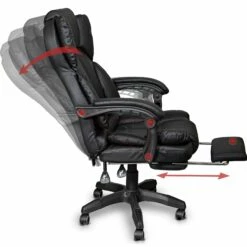 Er kann in eine Relaxposition (siehe Animation links) eingestellt werden und die Armlehnen passen sich der Position mit an.