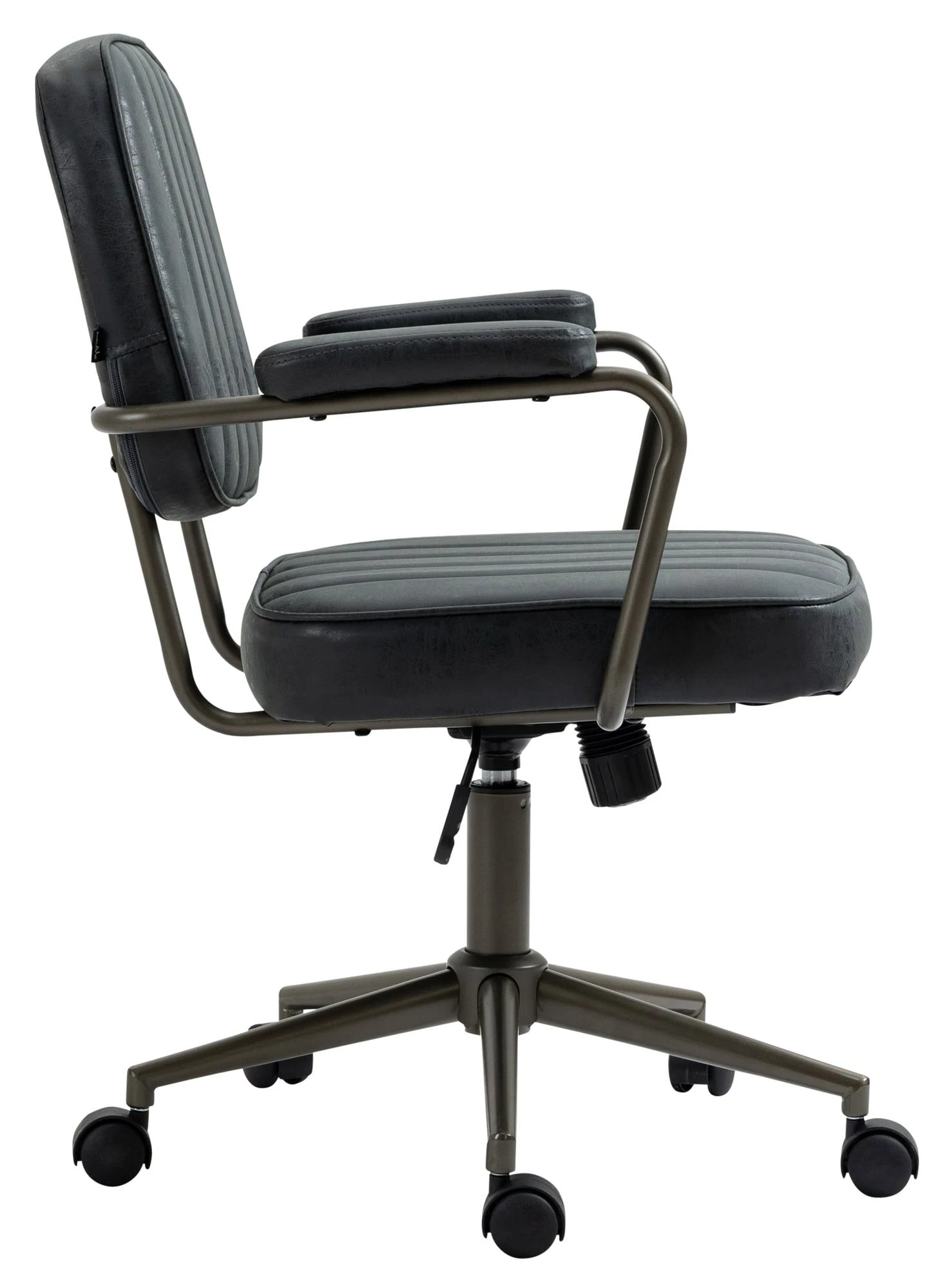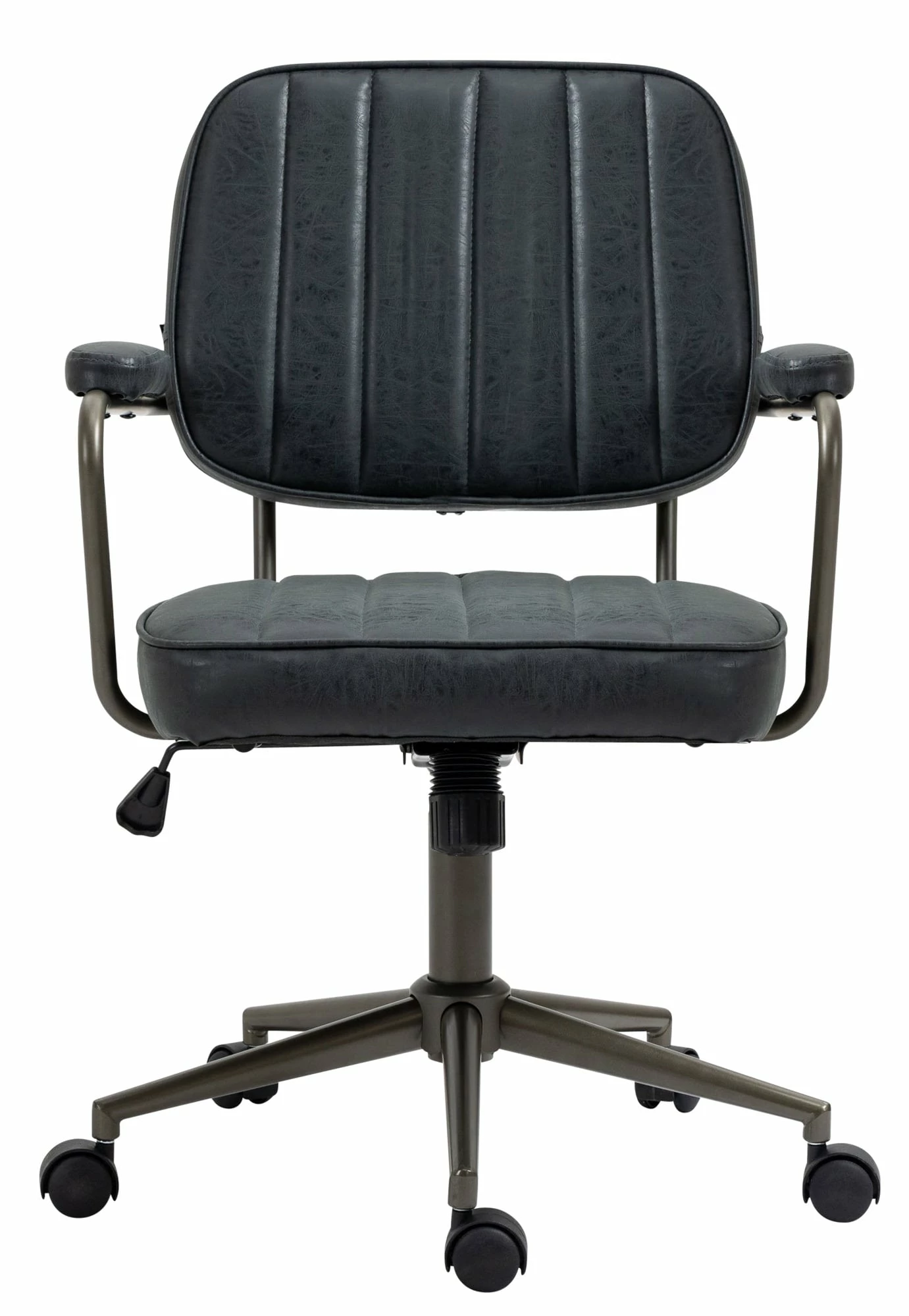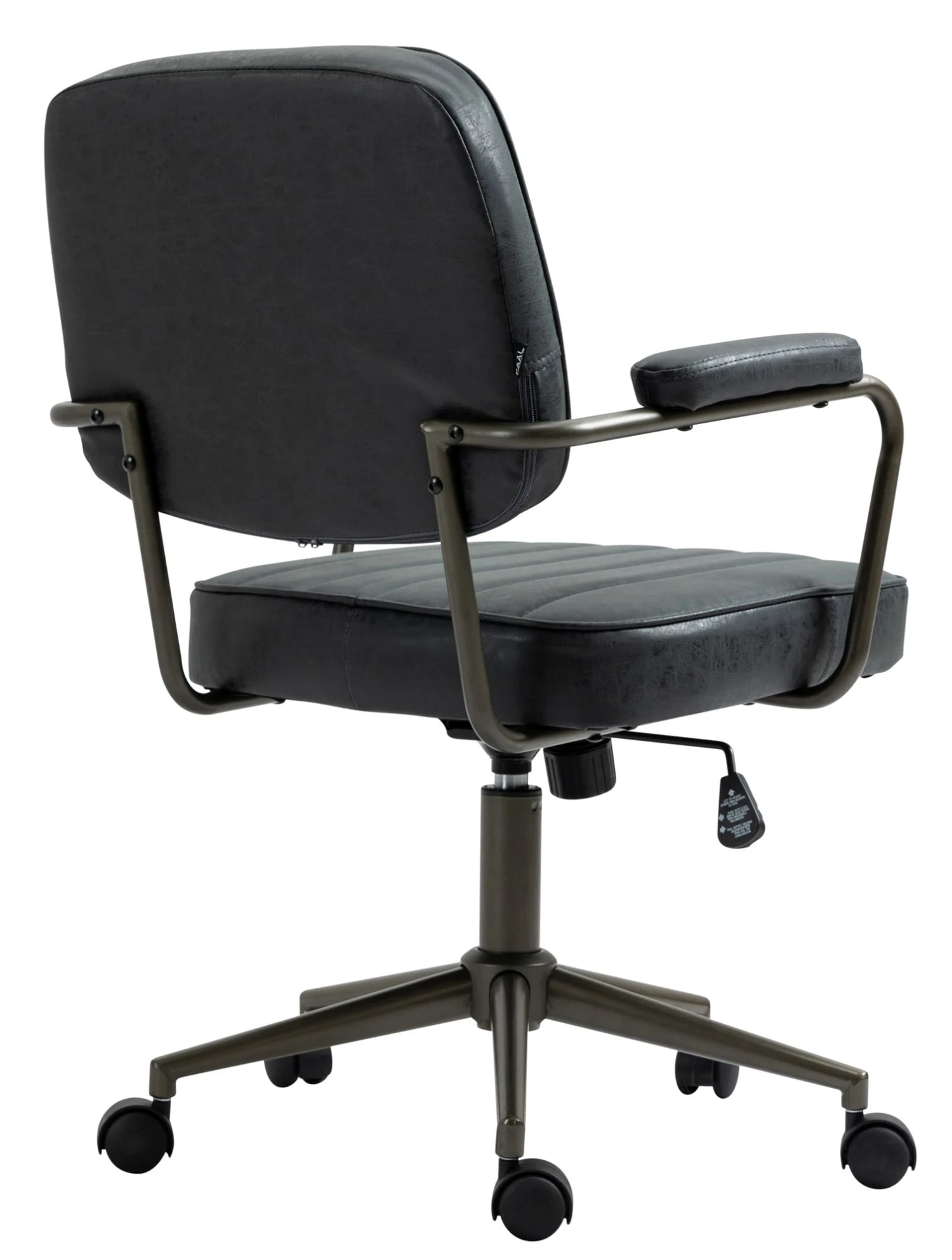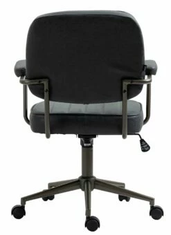 Der formschöne Bürostuhl Natrona überzeugt nicht nur mit seinem ausgeprägten Industrie-Look, auch in Sachen Komfort kann diesem Bürosessel keiner etwas vormachen. Der strapazierfähige Kunstlederbezug und seine hochwertige Polsterung sorgen für ein angenehmes Sitzgefühl über mehrere Stunden hinweg. Die Rückenlehne hat eine angenehme Form und die Sitzhöhe des Stuhls ist stufenlos verstellbar und garantiert ein ergonomisches Sitzen. Des Weiteren ist der Schreibtischstuhl mit einem Wippmechanismus versehen, der für mehr Bewegungsfreiheit sorgt. Die Stabilität ist durch das Metallgestell in Schwarz gewährleistet. Durch die fünf Leichtlaufrollen kann man leicht und locker über den Boden rollen – egal ob auf Hart- oder Teppichböden.