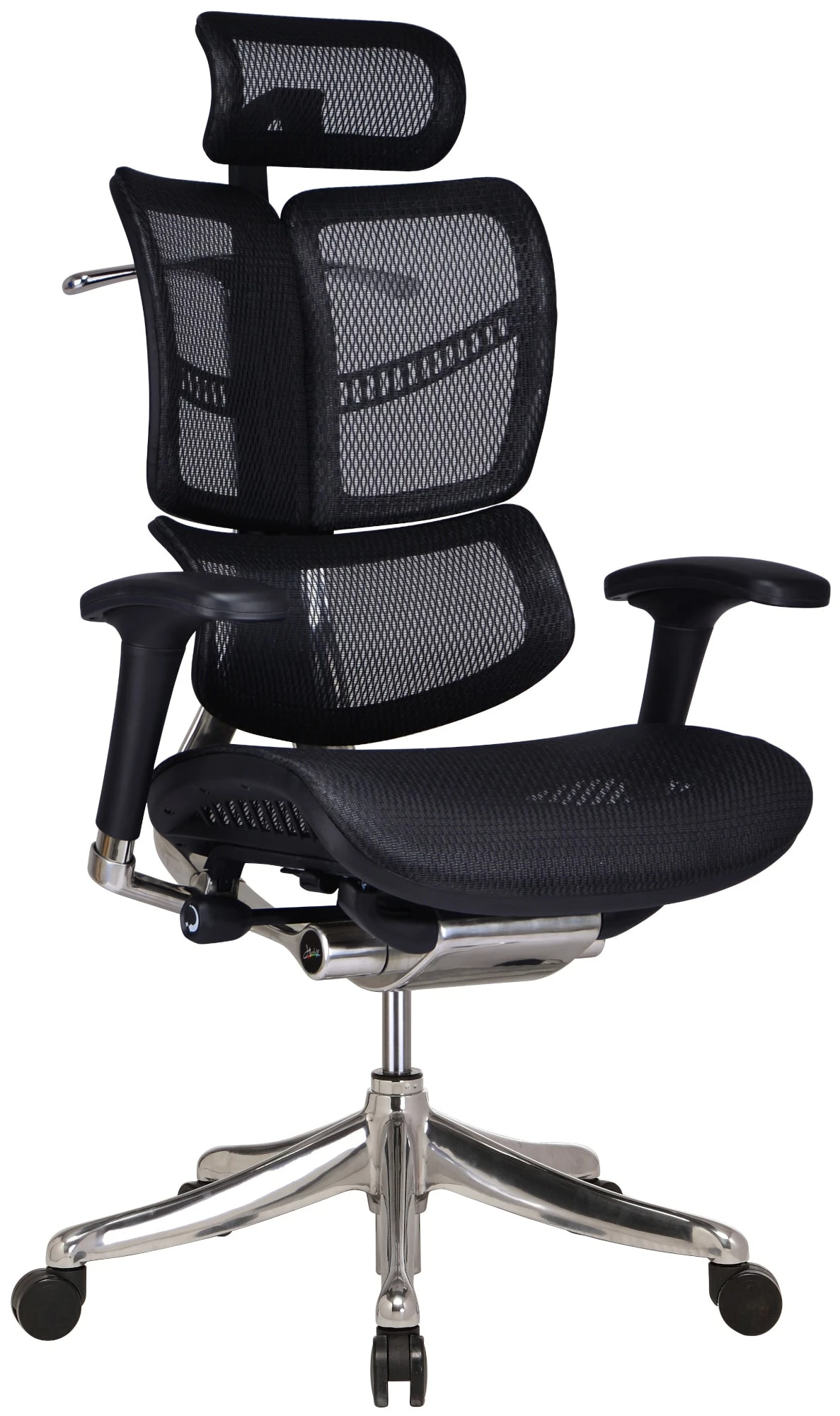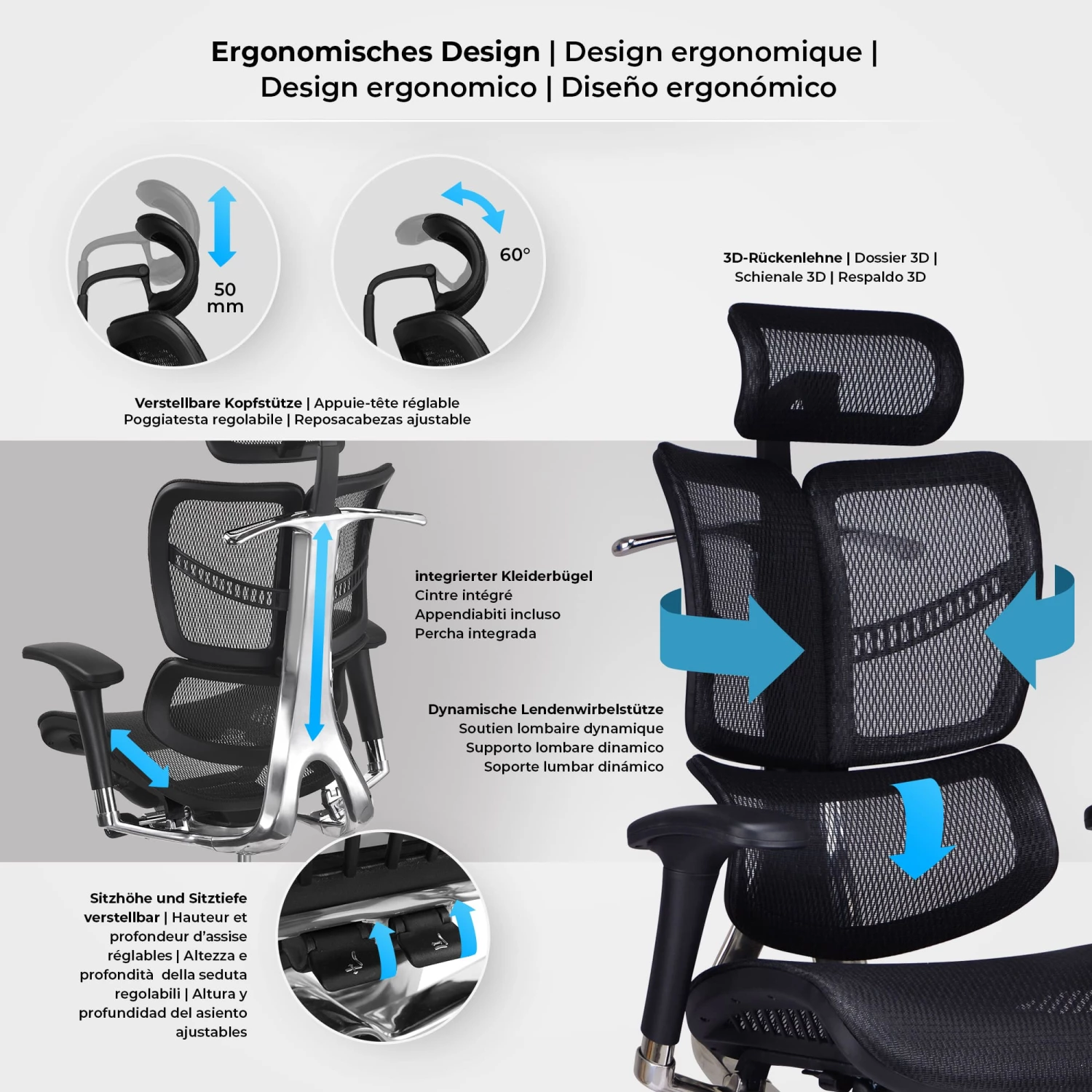 Herzstück des Arbeitsstuhls ist die multifunktionale Rückenlehne. Die vierstufig höhenverstellbare Lehne kann genau auf Ihre Bedürfnisse angepasst werden und die Bandscheiben entlasten. Bis zu 125° lässt sich die Rückenlehne kippen und die Kippspannung kann dabei separat eingestellt werden. Der Drehstuhl verfügt über eine Synchronmechanik, sodass sich die Sitzfläche mit der Rückenlehne in Einklang bewegt. Für noch mehr Ergonomie sorgt neben der Lendenwirbelstütze die 3D-Funktion der Rückenlehne. Dabei können Sie die beiden Hälften des oberen Lehnenteils auf Ihre Bedürfnisse anpassen. In Entspannungsphasen steht Ihnen die in Höhe und Winkel verstellbare Kopfstütze zur Verfügung.