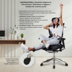 Die üppige Sitzfläche weist eine Krümmung auf, die die Belastung gleichmäßig auf Oberschenkel und Gesäß verteilt. Schließlich sorgen die 4D-Armlehnen für Entlastung der Schultern und Nackenpartie. 4D steht in diesem Zusammenhang für eine vierdimensionale Verstellbarkeit: Neben Höhen- und Tiefenverstellbarkeit sind die Armlehnen schwenkbar und in der Breite adjustierbar.