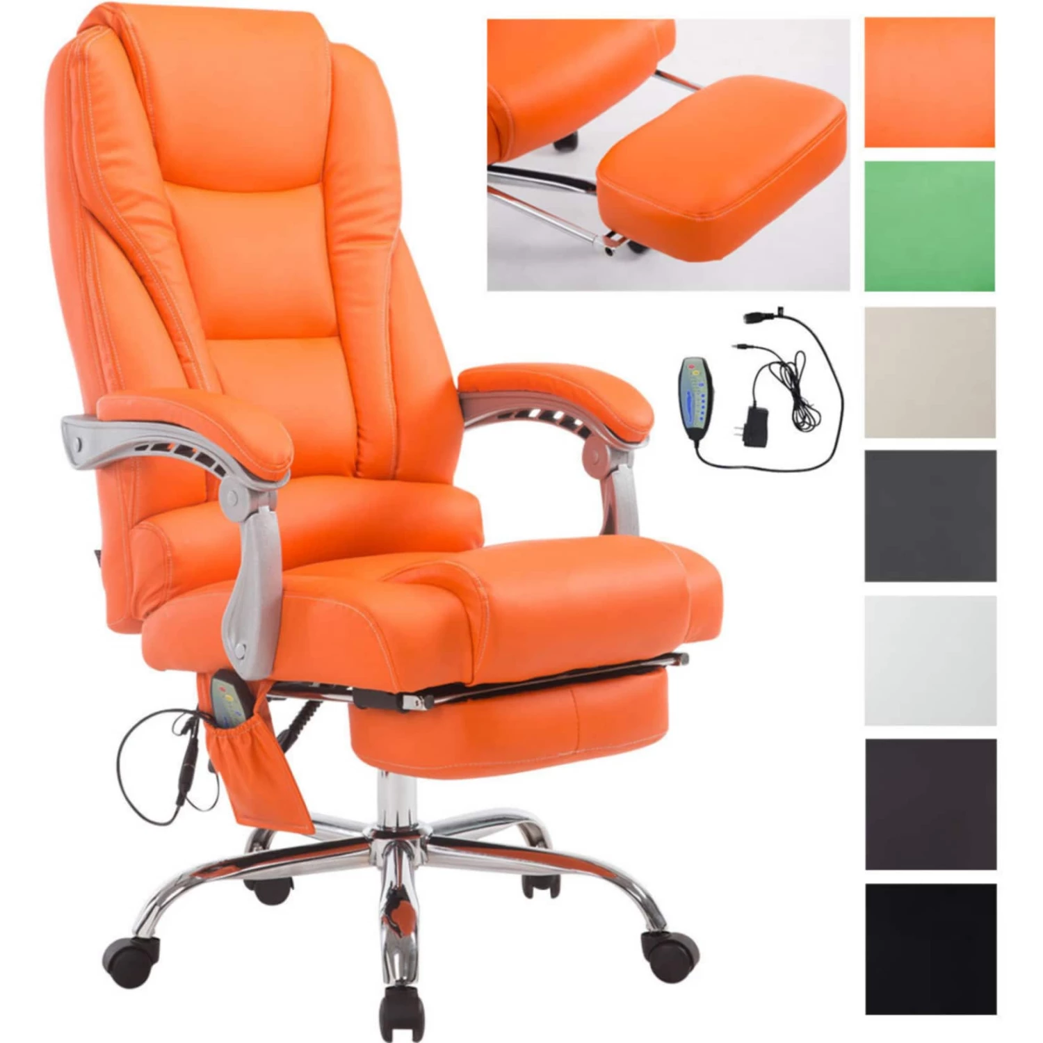 Auf außerordentlichen Sitzkomfort zahlen darüber hinaus auch die Fußablage und die neigbare Rückenlehne des ergonomischen Stuhls ein – zurücklehnen und genießen! Der Schreibtischstuhl ist stufenlos höhenverstellbar und um 360 Grad drehbar. Dabei steht er sicher auf dem Metallgestell und fünf Leichtlaufrollen, die den Stuhl auch auf Hart- und Teppichböden mobil halten. Der Massagestuhl ist bis 150 kg belastbar.