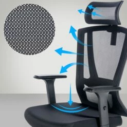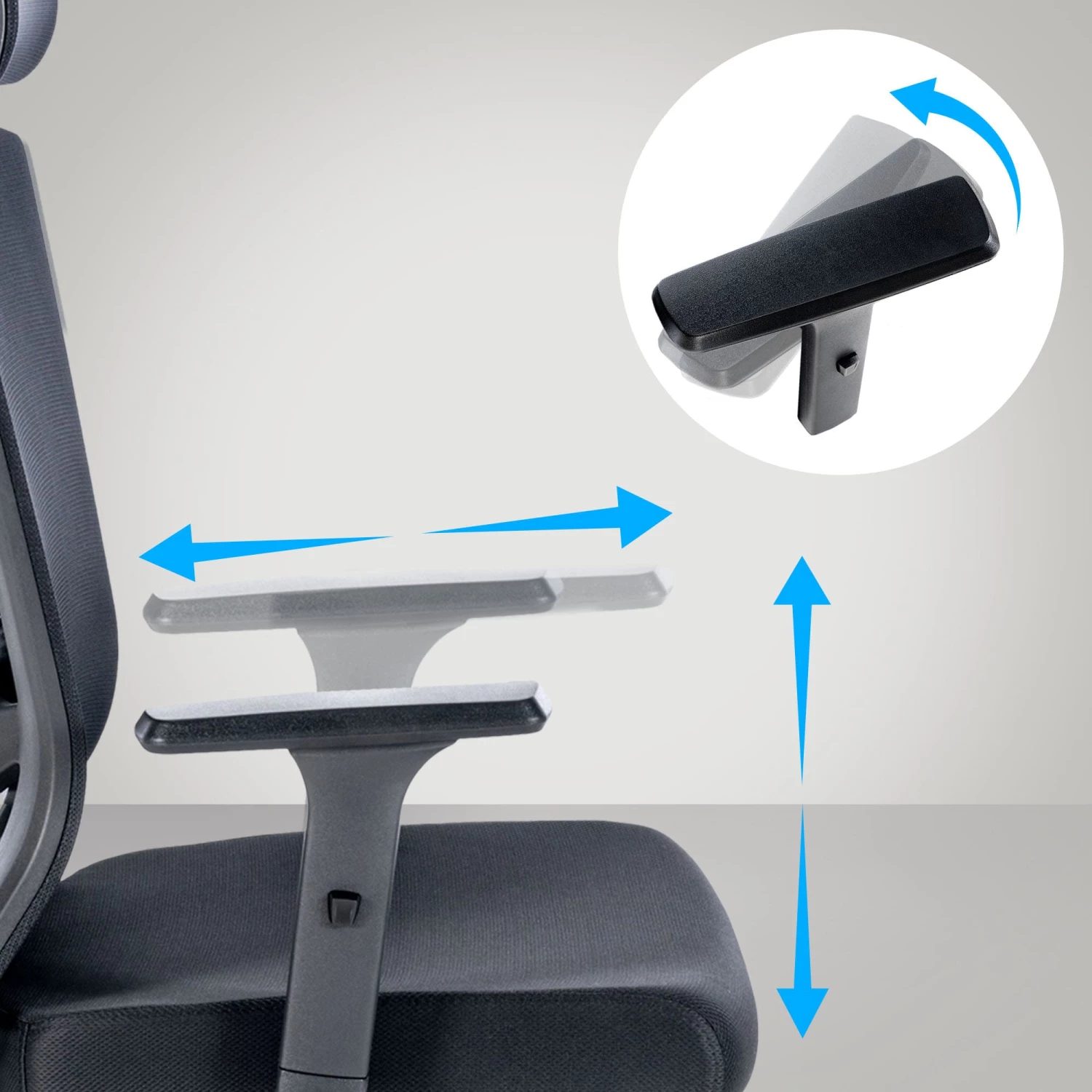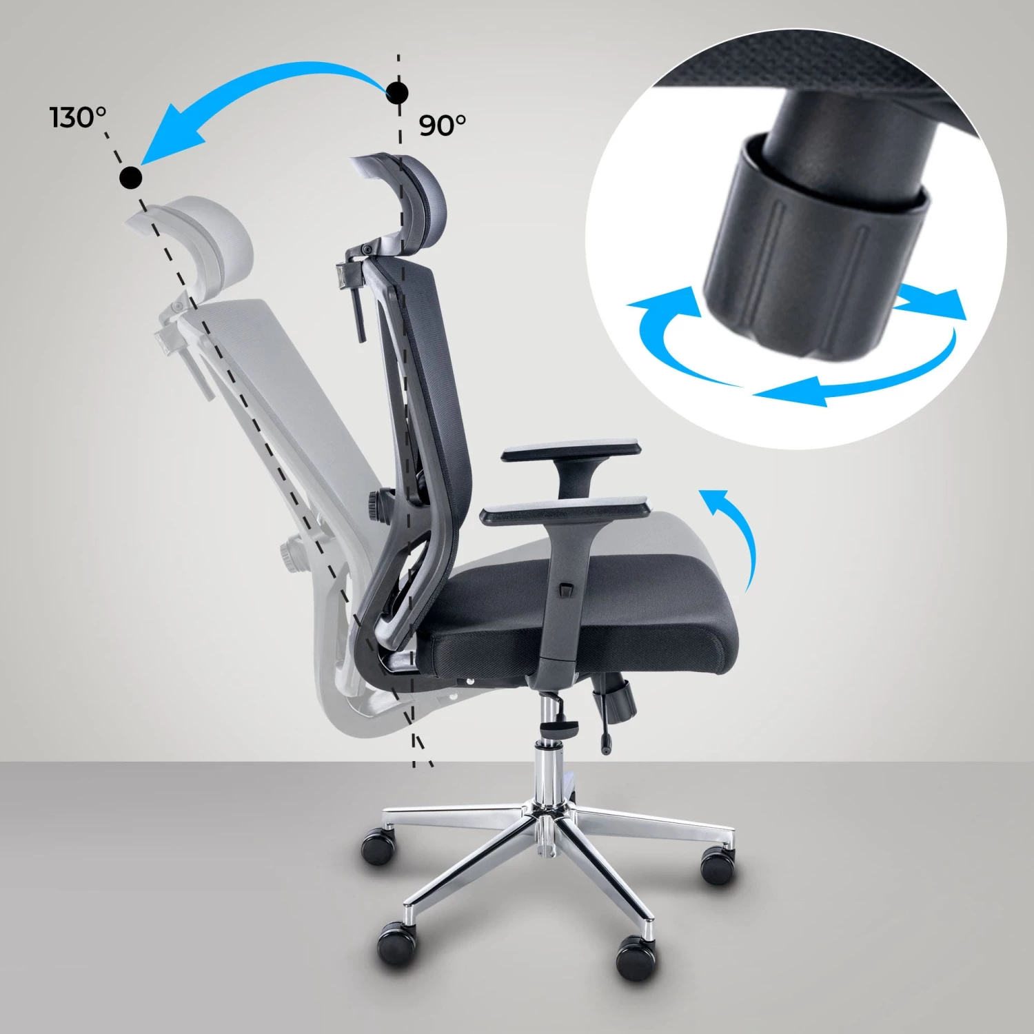 Die Ergonomie-Features sind zahlreich: Die Rückenlehne besitzt eine Kippfunktion mit Synchronmechanik, dreistufiger Fixiermöglichkeit und Regulierung der Kippspannung. Bis 130 Grad lässt sich der Stuhl neigen. Die Stärke der Lendenwirbelstütze kann angepasst werden, indem die Tiefe verstellt wird. Für Entlastung der Nacken- und Schulterpartie sorgen die höhenverstellbare Kopfstütze aber auch die 3D-verstellbaren Armlehnen. Dabei können die Armlehnen in der Höhe, in der Tiefe und in der Ausrichtung der Auflagefläche verstellt werden.