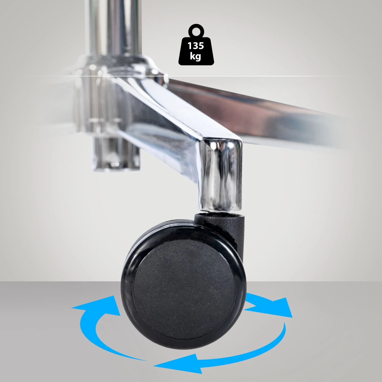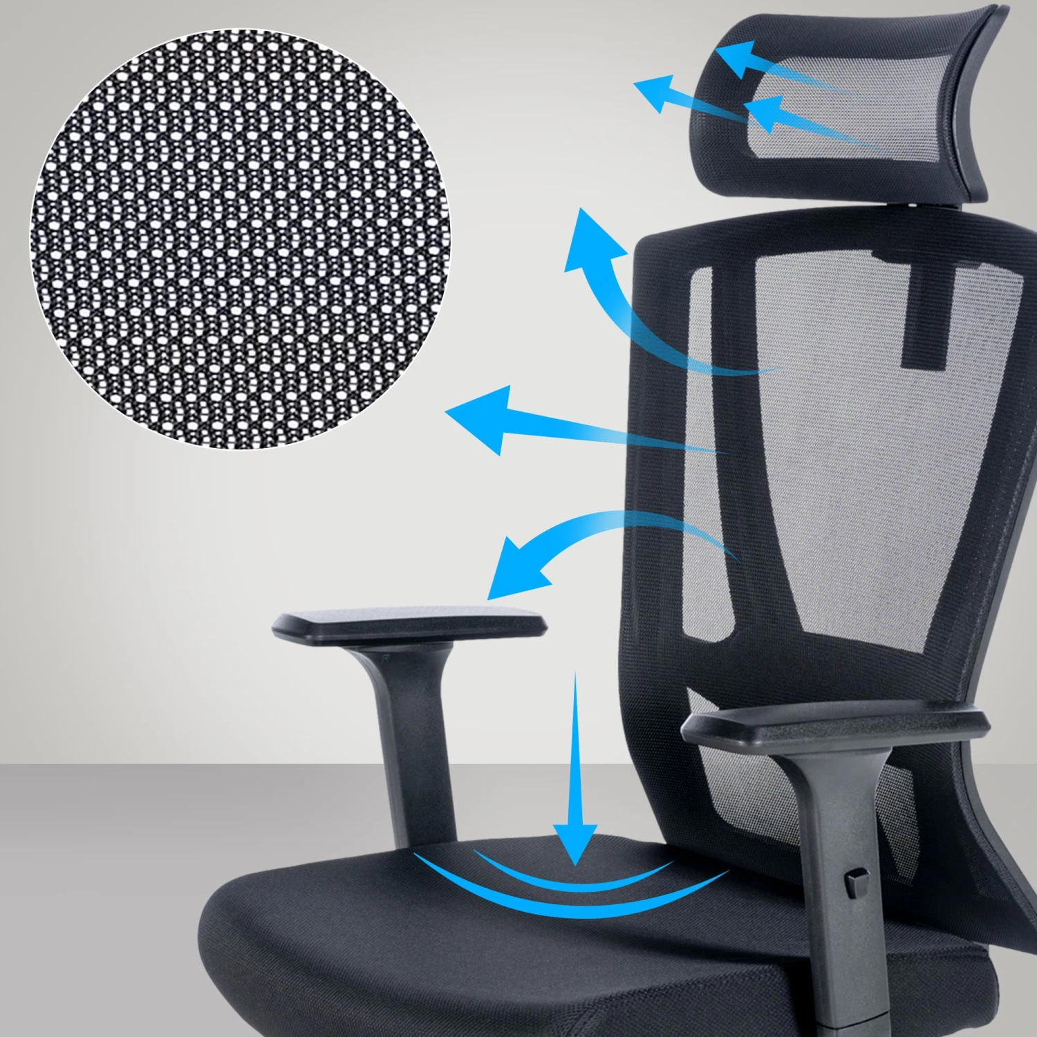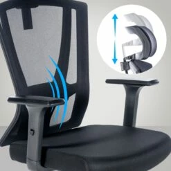 Darüber hinaus kann die Sitzfläche in der Tiefe angepasst werden und der Schreibtischstuhl ist über den BIFMA-zertifizierten Gaslift höhenverstellbar. Der atmungsaktive Netzbezug von Rückenlehne und Kopfstütze schafft weiteren Komfort, während die bequeme Polsterung der Sitzfläche mit strapazierfähigem Stoff bezogen ist. Stabilen Stand verleiht dem Drehstuhl schließlich das äußerst robuste Kunststoffgestell mit seinen Leichtlaufrollen. Der Bürostuhl ist bis maximal 135 kg belastbar.
