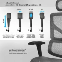 Die üppige Sitzfläche weist eine Krümmung auf, die die Belastung gleichmäßig auf Oberschenkel und Gesäß verteilt. Schließlich sorgen die 4D-Armlehnen für Entlastung der Schultern und Nackenpartie. 4D steht in diesem Zusammenhang für eine vierdimensionale Verstellbarkeit: Neben Höhen- und Tiefenverstellbarkeit sind die Armlehnen schwenkbar und in der Breite adjustierbar.