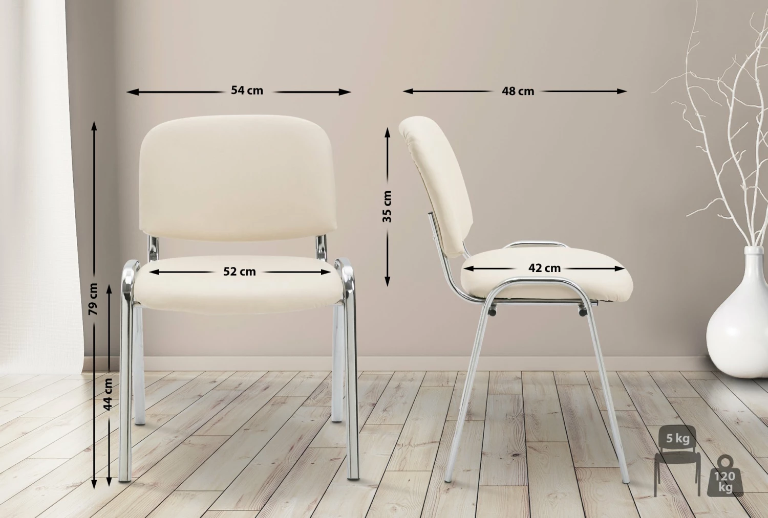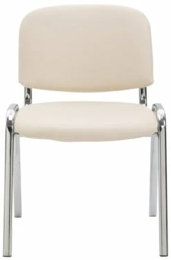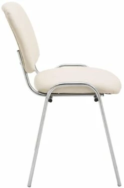 Neben Optik und zeitlosem Design zeichnet sich dieser Lehnstuhl besonders durch seine gepolsterte Sitzfläche aus, die auch längere Sitzphasen nicht anstrengend werden lässt. Die Sitzfläche und die Rückenlehne sind mit einem pflegeleichten Kunstlederbezug versehen. Standsicherheit und Stabilität werden durch das Vierfußgestell aus Metall in Chromoptik gewährleistet. Zudem ist dieser Konferenzstuhl bis zu vier Stühlen stapelbar und kann platzsparend gelagert werden. Dadurch eignet er sich ideal für Messen, Veranstaltungen oder ähnliches.