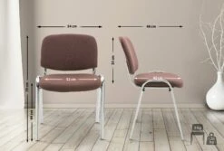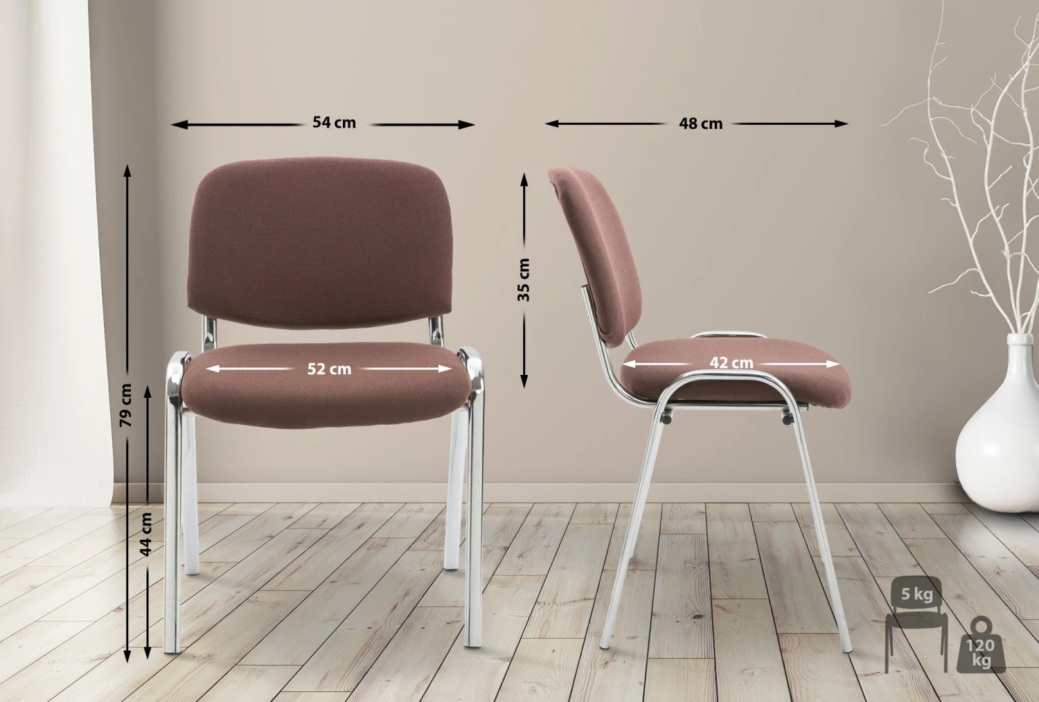 Neben Optik und zeitlosem Design zeichnet sich dieser Lehnstuhl besonders durch seine gepolsterte Sitzfläche aus, die auch längere Sitzphasen nicht anstrengend werden lässt. Die Sitzfläche und die Rückenlehne sind mit einem pflegeleichten Stoffbezug versehen. Standsicherheit und Stabilität werden durch das Vierfußgestell aus Metall in Chromoptik gewährleistet. Zudem ist dieser Konferenzstuhl bis zu vier Stühlen stapelbar und kann platzsparend gelagert werden. Dadurch eignet er sich ideal für Messen, Veranstaltungen oder ähnliches.