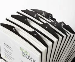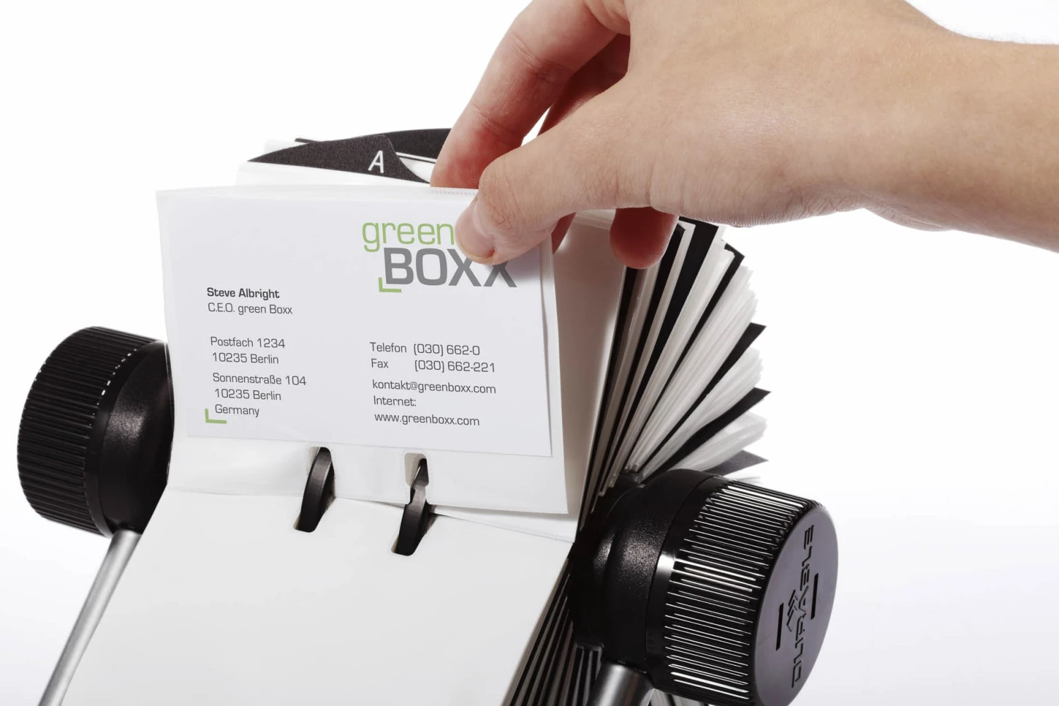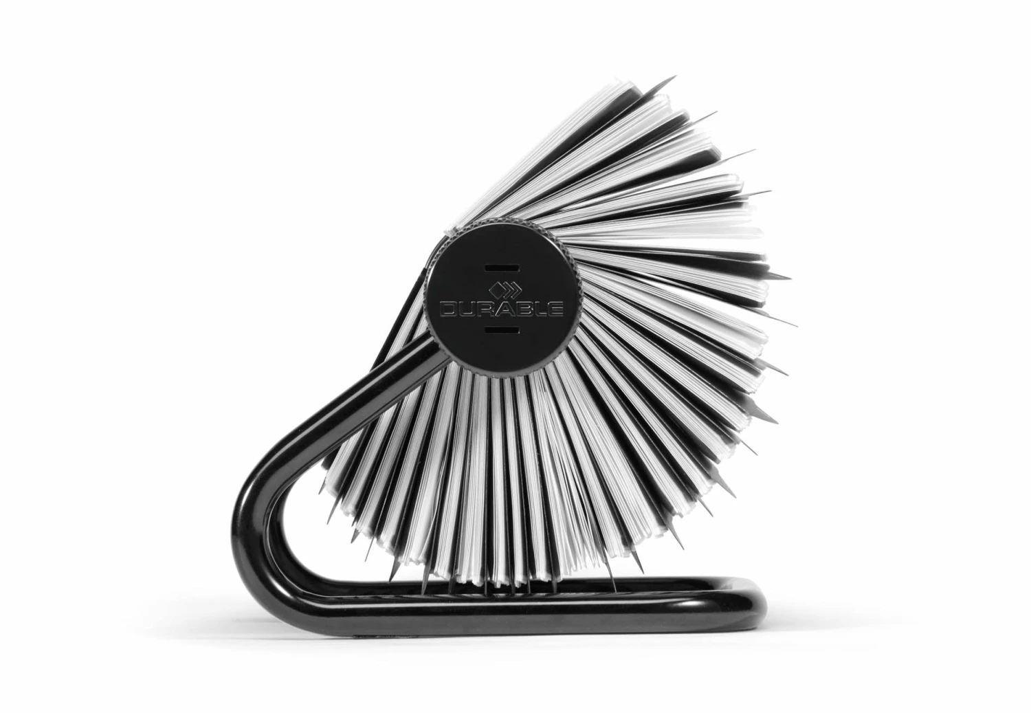 Professionelle Visitenkartenorganisation mit VISIFIX: Rotationskartei für die Archivierung von Visitenkarten. Mit 200 Visitenkartenhüllen im Format 104 x 72 mm für 400 Karten. Inkl. 25-teiligem Register A-Z. Gezielter Zugriff durch speziellen Rollmechanismus möglich. Leichtes Entnehmen und Einstecken der Hüllen. Farbe: Schwarz. Mit Artikel 241819 um zusätzliche Hüllen erweiterbar. – Durable ist eines der führenden deutschen Markenunternehmen im Bereich Büroorganisations- und Präsentationsmittel. – Umweltfreundlich in Anlehnung an die ISO 14021: 100 % recycelbar, bis zu 35 % Recyclinganteil