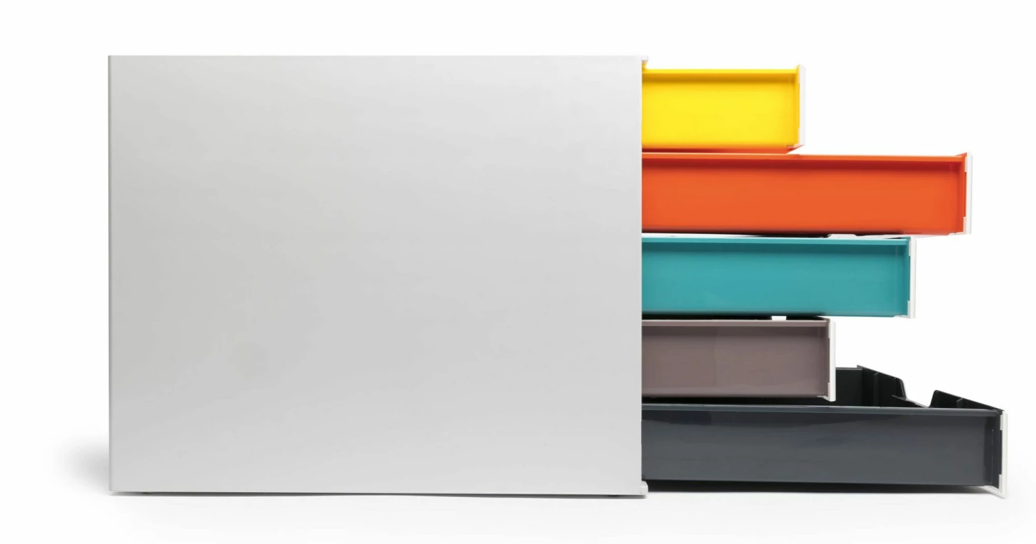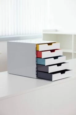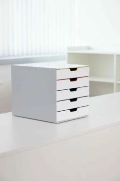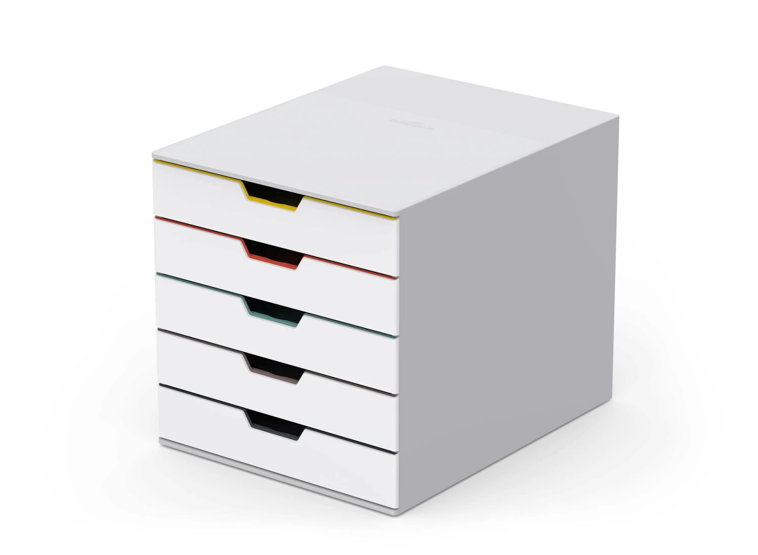 Schubladenbox VARICOLOR MIX 5. Verwendung für Papierformate: DIN A4, C4 sowie Folio- und Letter-Size-Format. Anzahl der Schubfächer: 5 Stück. Ausführung des Öffnungszustandes: geschlossen. Ausführung: Auszugsperre vorhanden, Griffloch/Griffmulde vorhanden, Beschriftungsfeld vorhanden, stapelbar. Feine Farblinien dienen bei geschlossenen Schubladenfronten als Organisations- und Orientierungshilfe, mit beiliegenden transparenten Beschriftungsfenstern und computerbeschriftbaren, leicht auswechselbaren Einsteck-Etiketten. Werkstoff: Kunststoff. Größe (B x H x T): 280 x 292 x 356 mm. Schubladenbox weiß mit farbigen Schubladen. – Durable ist eines der führenden deutschen Markenunternehmen im Bereich Büroorganisations- und Präsentationsmittel. – Umweltfreundlich in Anlehnung an die ISO 14021: 100 % recycelbar