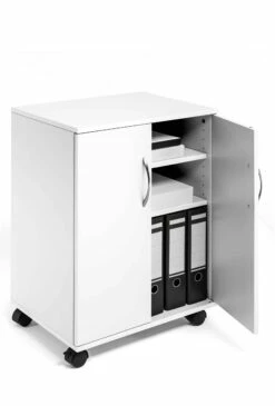 Weißer Rollschrank mit zwei Türen zur Ablage von Kopierpapier, Ordnern und Dokumenten. Ideal als Beistellwagen für Drucker, Kaffeemaschine oder andere Bürogeräte. – Durable ist eines der führenden deutschen Markenunternehmen im Bereich Büroorganisations- und Präsentationsmittel.
