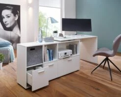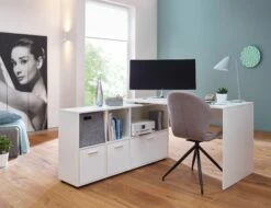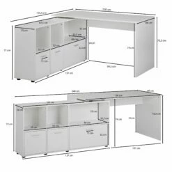 - Das Regal lässt sich drehen – dadurch ist der Bürotisch auch als Eckschreibtisch verwendbar