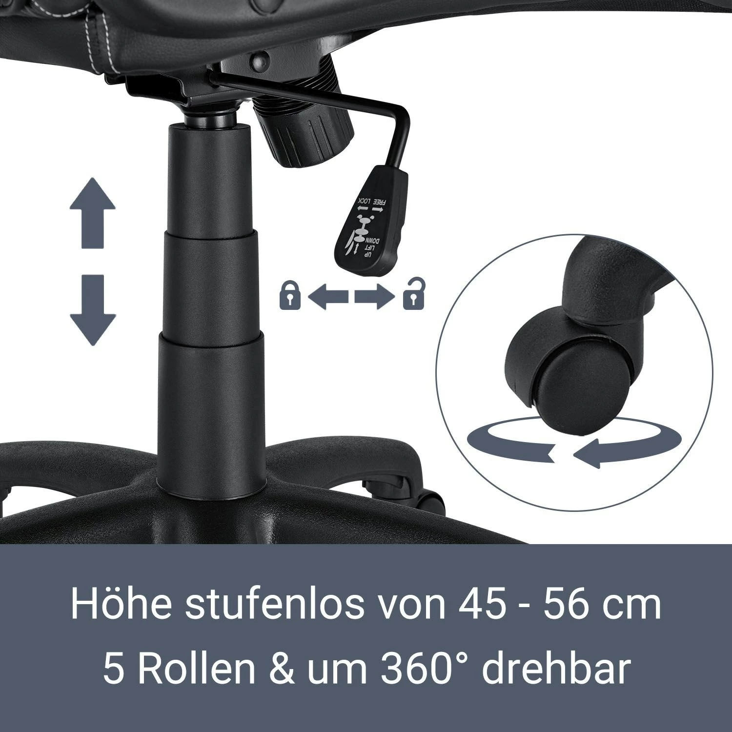 Die Sitzfläche lässt sich mit der Gasdruckfeder stufenlos in der Höhe zwischen 46 und 56 cm verstellen. Dadurch positionieren Sie den Schreibtischstuhl auf die gewünschte Sitzhöhe. Der Computerstuhl ist um 360° frei drehbar. Dies gewährt größtmögliche Bewegungsfreiheit.