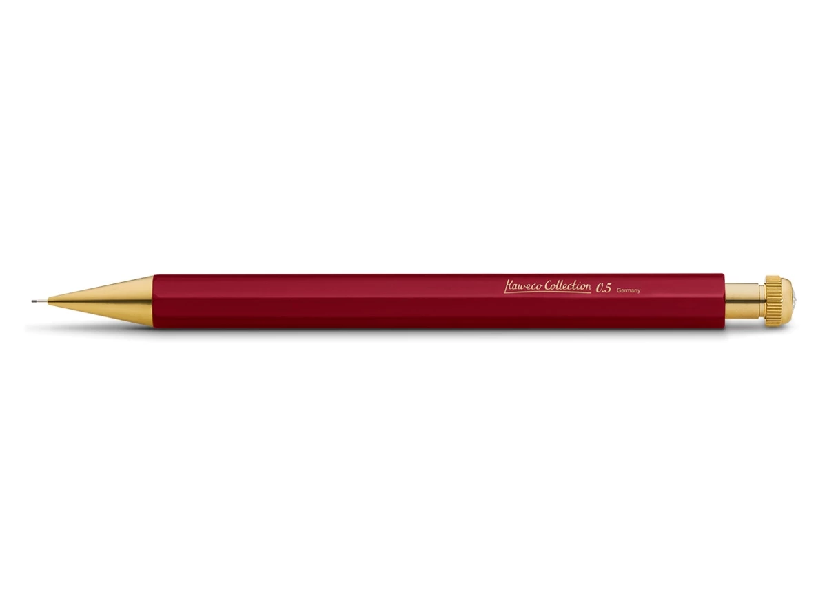 Farblich darauf abgestimmt ist ein rotes Lederetui in Veloursoptik erhältlich, das perfekt auf einen Stift der Serie Special zugeschnitten ist. Außerdem gibt es für Druckbleistifte von Kaweco die passenden Nachfüllminen und Ersatzradiergummies.