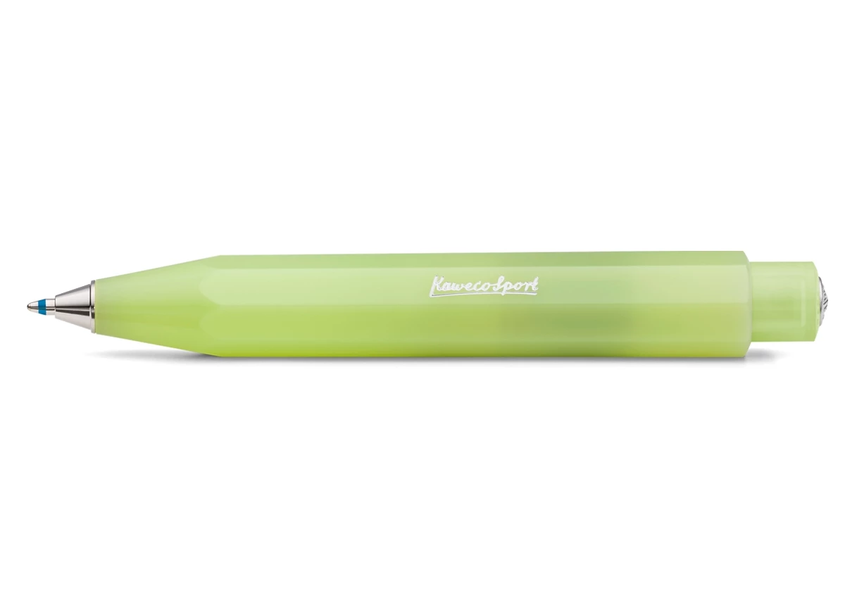 Die Schreibgeräte der Serie Frosted Sport kommen in frischen, pastelligen Farben und zeichnen sich durch einen leicht opaken, milchigen Kunststoff aus. Die Serie verleiht dem klassischen Kaweco Sport einen komplett modernen Touch. Passend zu den kühlen Farbtönen, wurden die Elemente wie Logokappe in Silber gehalten. Der Kugelschreiber hat eine Länge von 10,5 cm und funktioniert mit einer hochwertigen Herzkurvenmechanik. Diese arbeitet besonders präzise und geräuschlos beim Betätigen des Drückers.