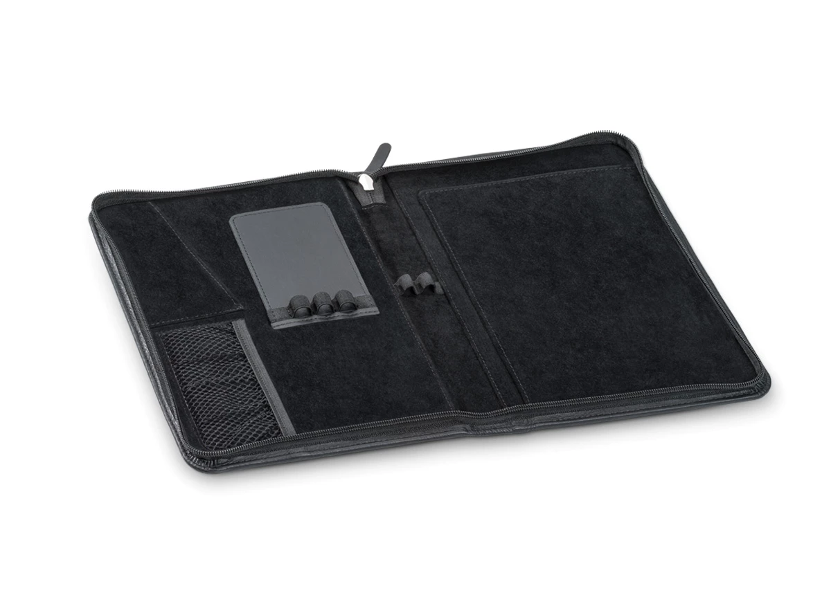 Die wertige DIN A5 Ledermappe wird in Europa aus italienischen Leder gefertigt und genäht. Das Innenmaterial ist mit einem feinen Samtfutter ausgestattet, um die darin untergebrachten Utensilien vor Beschädigungen zu schützen.