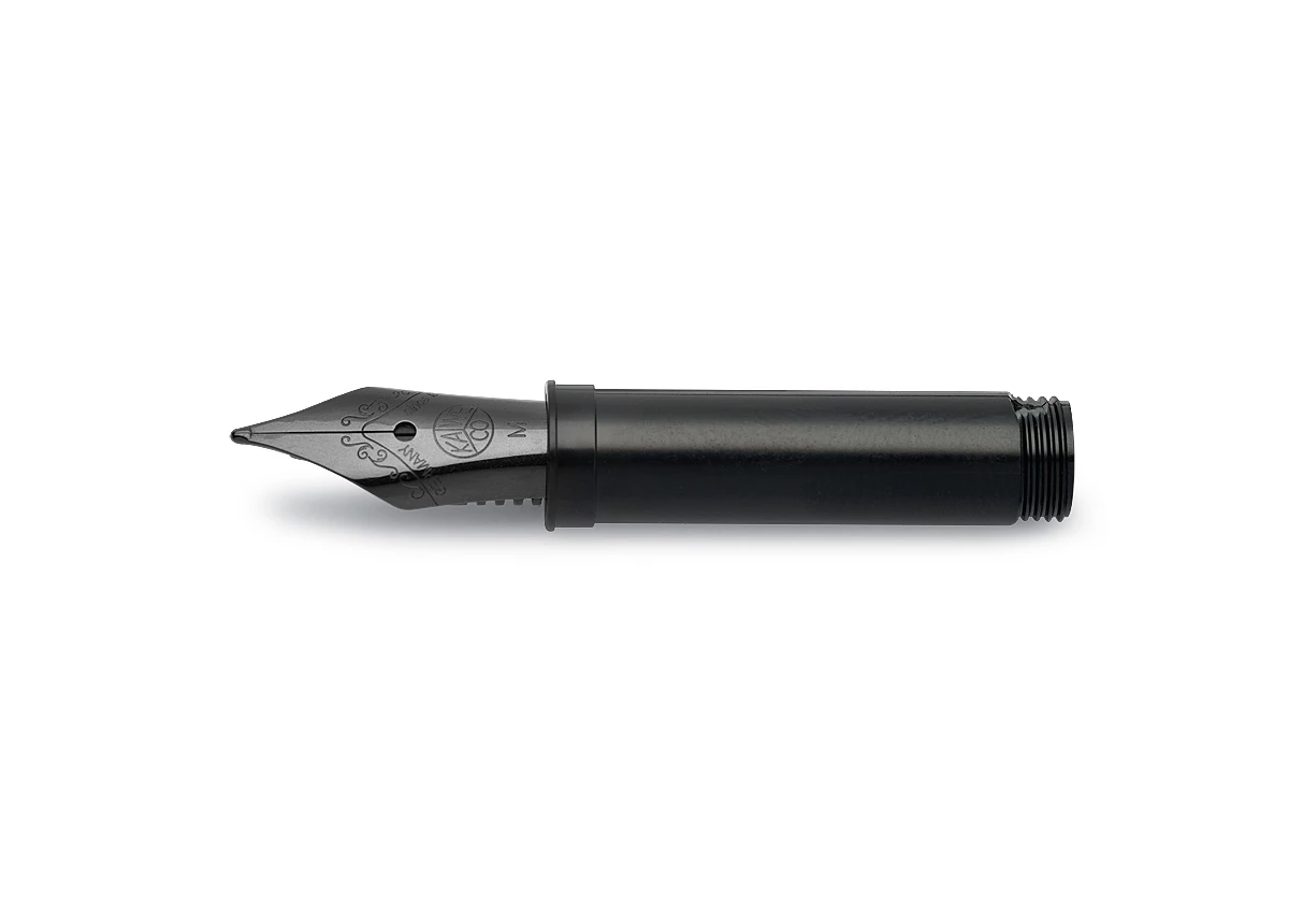 Die Carbon-Schwarz beschichtete Stahlfeder ist mit der DLC (Diamond like Carbon) ein echtes Arbeitsgerät. Diese Beschichtung der Feder ist extrem haltbar. Ein Iridium-Korn an der Spitze und ein exakt nachgemessener Federnschlitz minimieren die Toleranzen der Strichbreiten von Extra Fein bis Extra Breit.