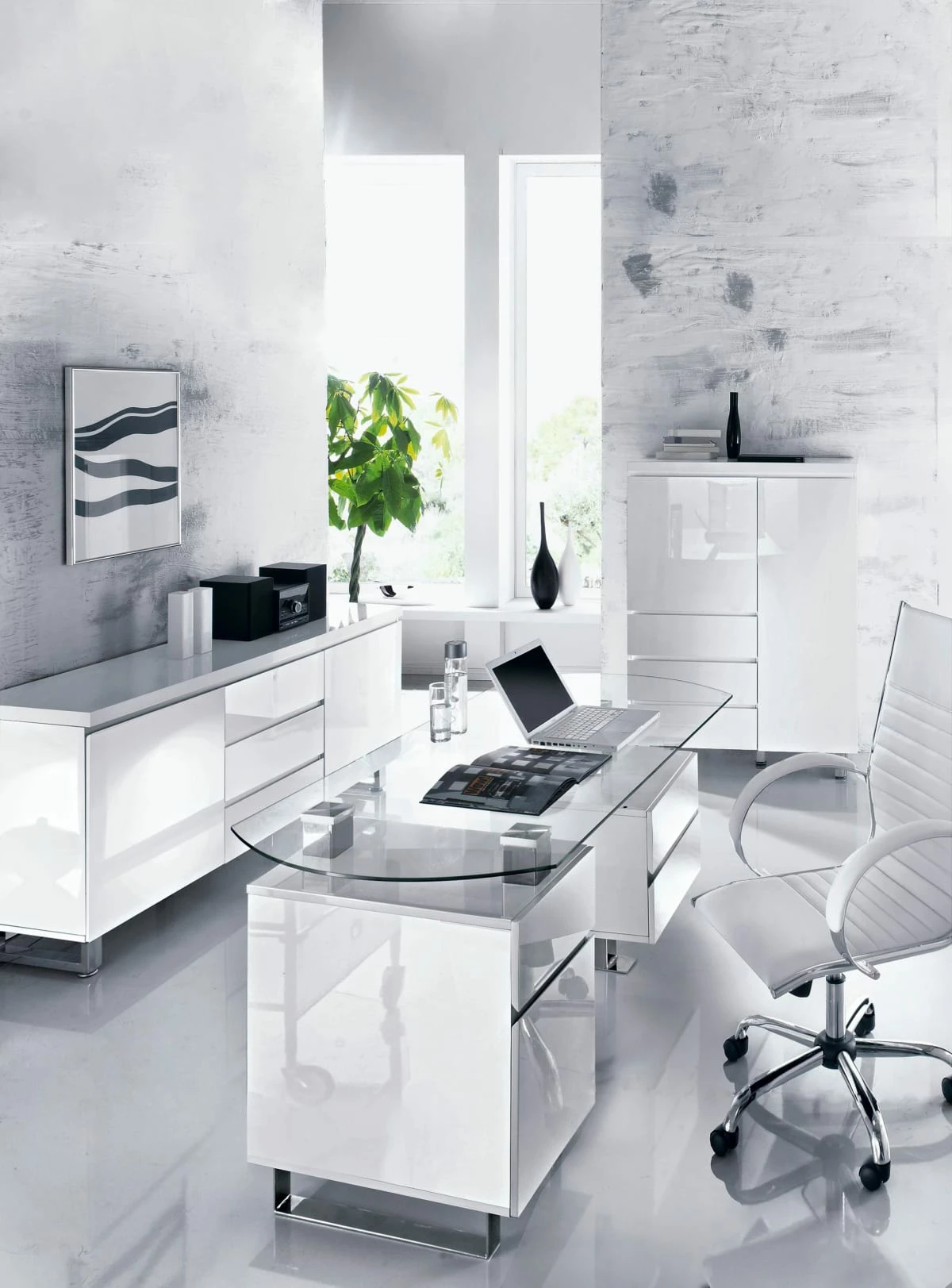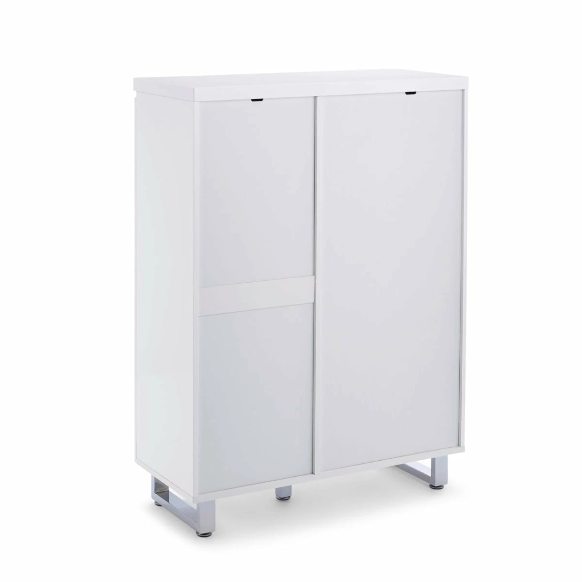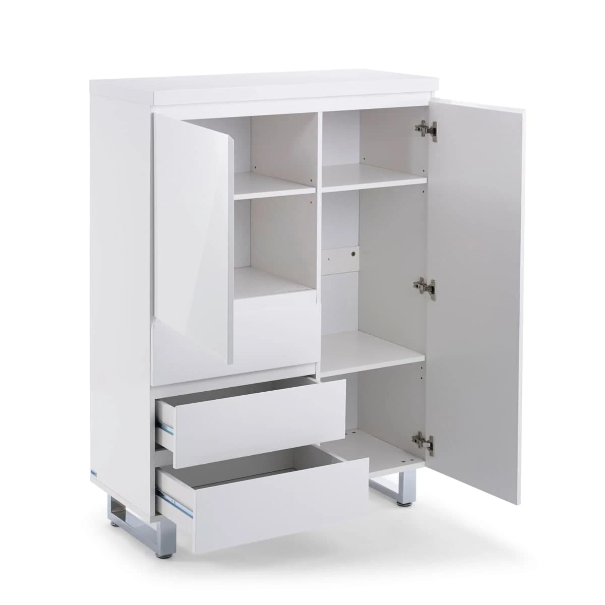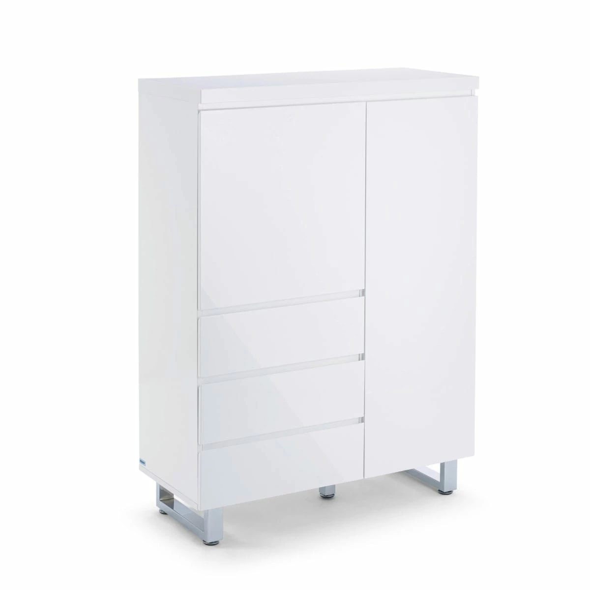 Moderner Schrank hochglänzend weiß lackiert. Mit drei Schubladen und zwei Türen