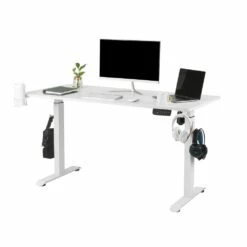 Der funktionale, auf eine lange Lebensdauer ausgelegte Computertisch zeichnet sich durch robuste Stahlfüße in den Farbtönen Weiß und Schwarz aus. Extra dicker Stahl sorgt für eine hohe Standfestigkeit und Stabilität. Selbst in maximaler Arbeitshöhe wackelt der Schreibtisch nicht und Sie können in Ruhe arbeiten. Extras – wie ein verstellbarer Kopfhörerhalter und ein verstellbarer Getränkehalter – machen den Tisch zu einer komfortablen Arbeitsumgebung, die Sie Ihren individuellen Bedürfnissen anpassen können. Die Höhenverstellung des Tischgestells erfolgt elektrisch über ein intuitiv bedienbares, übersichtliches Control Panel. Die Höhe des Tisches ist in einer Spanne von 75 – 115 cm einstellbar.