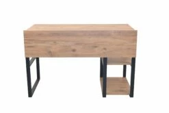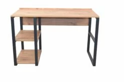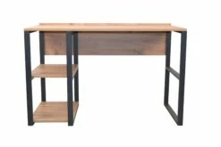Moderner Schreibtisch mit einem Gestell aus Metall, schwarz pulverbeschichtet. Die zwei Ablagen links, oben eine große Tischplatte und die halbhole Rückwand sind aus Holzwerkstoff gefertigt und mit einem trendigen eichefarbenen Holzdekor beschichtet. Lieferung vom Schreibtisch erfolgt zur Selbstmontage, inklusive Aufbauanleitung. Maße ca. cm: (B/H/T) 120/75/62. Facheinteilungen links: Breite 27 cm Höhe 33 cm.
