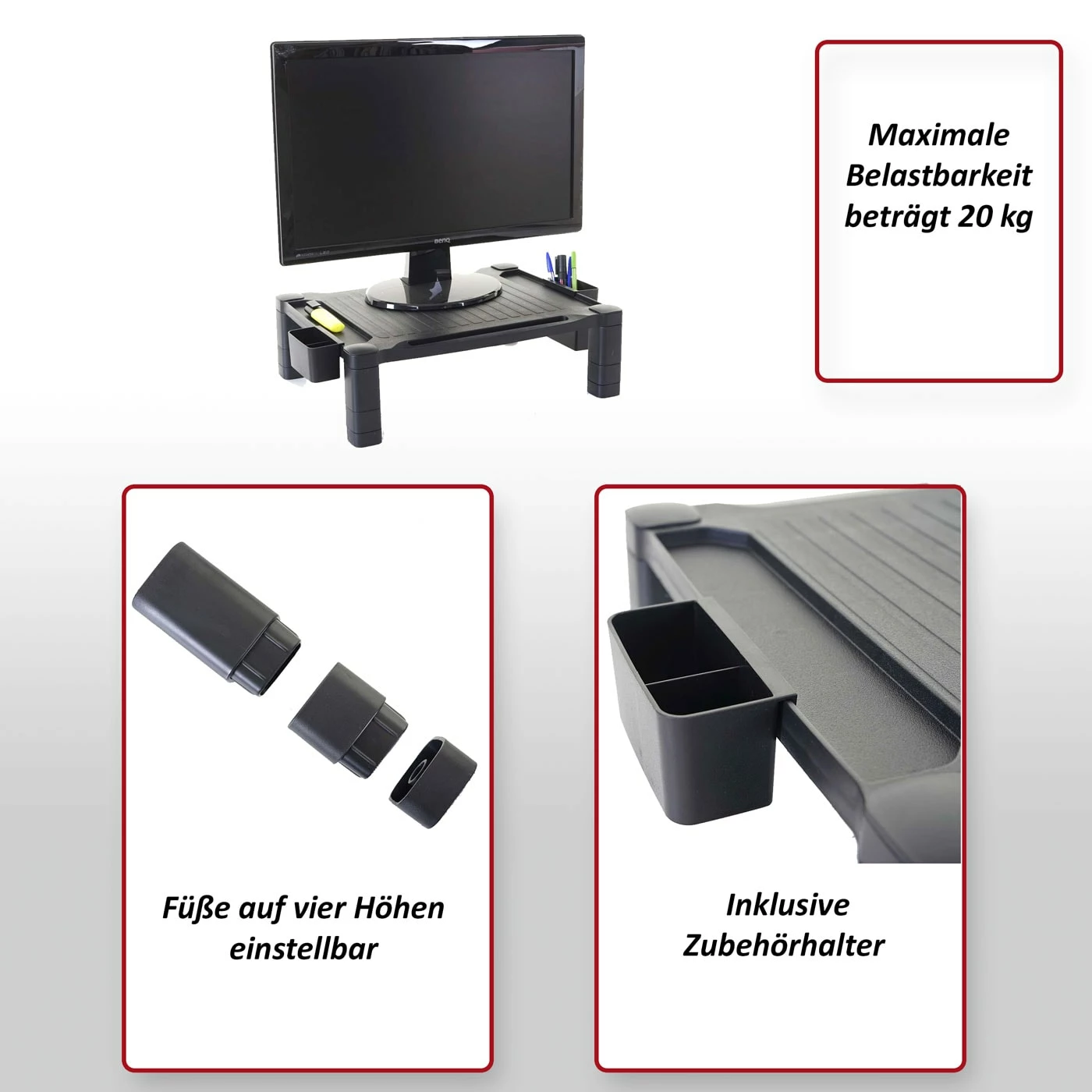 Sie suchen nach einer Monitorerhöhung, die Sie ganz individuell anpassen können? Dann sind Sie bei uns genau richtig: Unsere Monitorerhöhung hebt sich durch ihre in drei Teile zerlegbaren Füße von der breiten Masse ab. Dadurch ist es Ihnen ganz leicht möglich, den Monitorständer genau auf die für Sie passende Höhe umzubauen, ein kleiner Handgriff genügt hierzu. Ebenso praktisch sind die beiden Zubehörhalter, die je nach Bedarf an den Seiten der Monitorerhöung ein- oder auch ausgehängt werden können. Sofern Sie die Monitorerhöhung auf der niedrigsten Höhe verwenden, können die Zubehörhalter auch neben den Schreibtischaufsatz gestellt oder ganz weggelassen werden. Durch die Aussparung im hinteren Bereich werden Kabel platzsparend verstaut und sorgen für Ordnung.