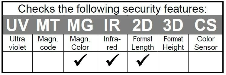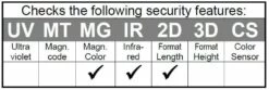 Prüft folgende Sicherheitsmerkmale: MG, IR, 2D