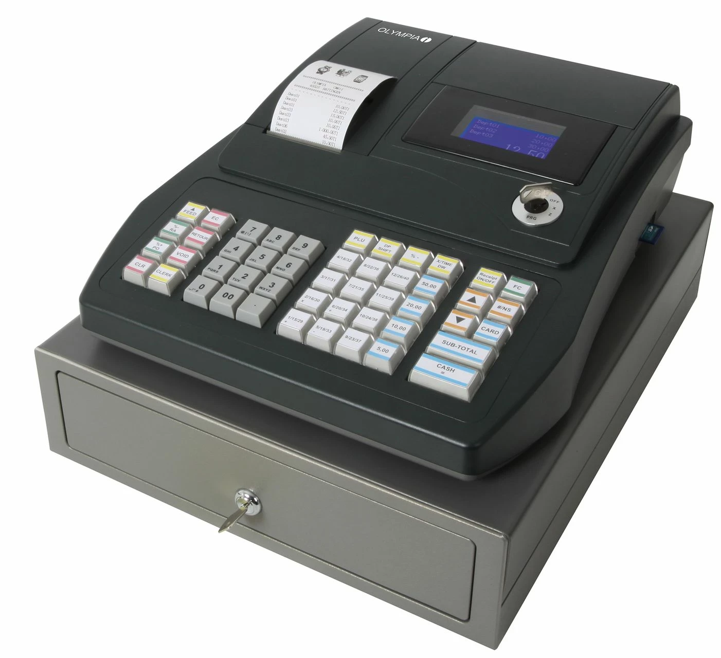 Die Registrierkasse Olympia CM941 TSE ist eine vielseitige und zuverlässige Kasse, die speziell für den Einsatz im Handel und in der Gastronomie entwickelt wurde. Die Kasse ist GoBD/GDPdU-konform und erfüllt damit alle Anforderungen an eine ordnungsgemäße Buchführung. Im Lieferumfang sind neben der Kasse auch eine SD-Karte, ein USB-Kabel, ein Programmierkabel, eine Bonrolle, eine TSE 3 Jahres-Lizenz, ein Funktionsschlüsselsatz, zwei Schubladenschlüssel und eine TSE-Box enthalten. Hier die wichtigsten Eigenschaften im Detail: