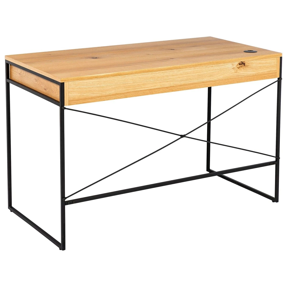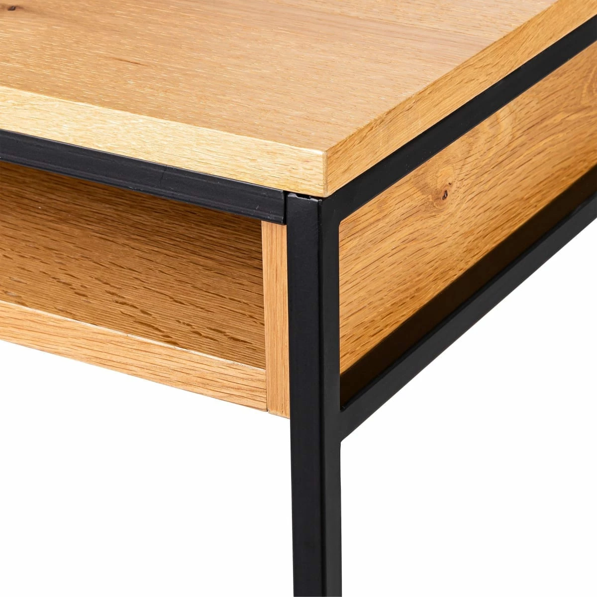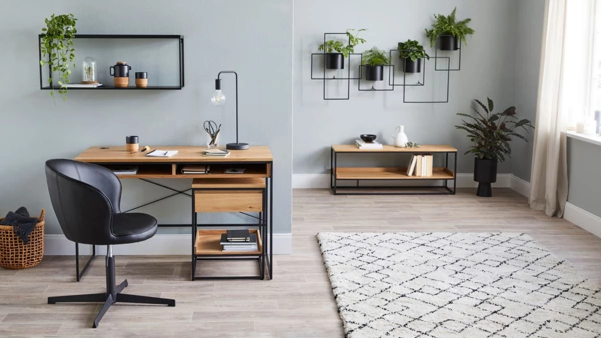 Der zierliche Schreibtisch mit den offenen Fächern findet auch in kleinen Räumen einen Platz und überzeugt durch sein minimalistisches Design. Das schwarze Metallgestell und die Tischplatte im natürlichen Eichenholz-Look harmonieren perfekt – eine schöne Materialkombination, die besonders gut zum urbanen Industrial-Style passt.