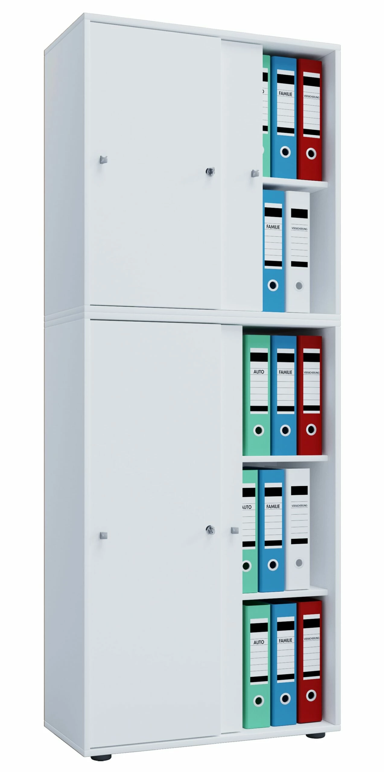 Der VCM Büroschrank “Lona XXL mit abschließbaren Schiebetüren” hat vier Fachböden und Platz für 35 Aktenordner und andere Utensilien. Der Korpus besteht aus einer Holzstruktur-Nachbildung und besitzt eine stabile Rückwand.