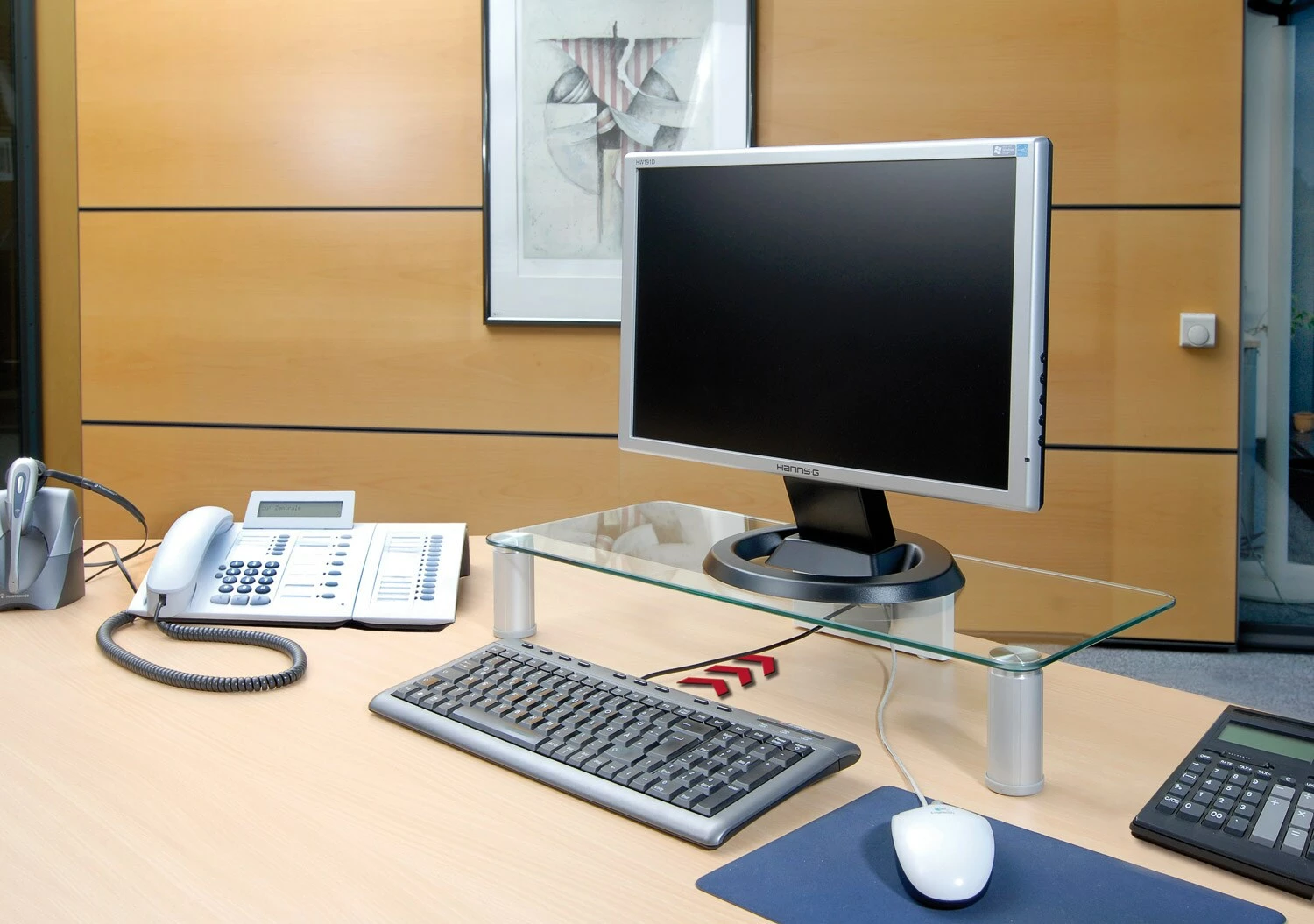 Zu tiefe und zurückgeneigte Bildschirme strapazieren die Augen, Nacken und den Rücken, was durch eine erhöhte Platzierung des TFTs vermieden werden kann. Ein weiterer Vorteil ist, dass Tastatur, Maus und weitere Büromaterialien platzsparend unter dem TFT integriert werden können, was zusätzliche Arbeitsflächen schafft. Lieferung ohne Dekoration.