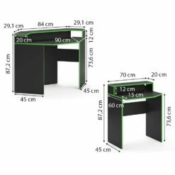 • Die Gesamtmaße vom Computertisch (Ecke) betragen 90 x 87,2 x 90 cm (BxHxT) und vom Computertisch (kurz) 70 x 87,2 x 60 cm (BxHxT).