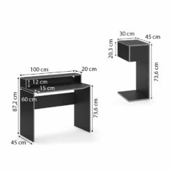 • Die Gesamtmaße vom Computertisch (lang) betragen 100 x 87,2 x 60 cm (BxHxT) und vom Computerschrank 30 x 73,6 x 45 cm (BxHxT).