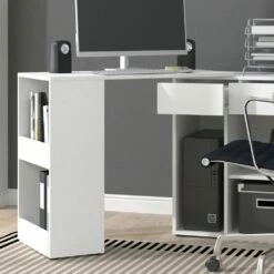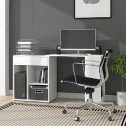 Durch seine anpassungsfähige Stellweise lässt sich dieser Schreibtisch vielfältig in den entsprechenden Wohnbereich integrieren und bietet dank des geräumig aufgeteilten Sideboards, inklusive zweier Schubladen, viele Organisationsmöglichkeiten.