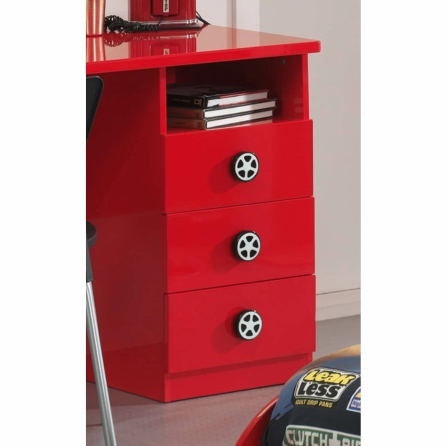 Rot Lackiert und mit Griffen im Felgendesign läßt dieser Schreibtisch die Herzen kleiner Formel 1 Fans höher schlagen.